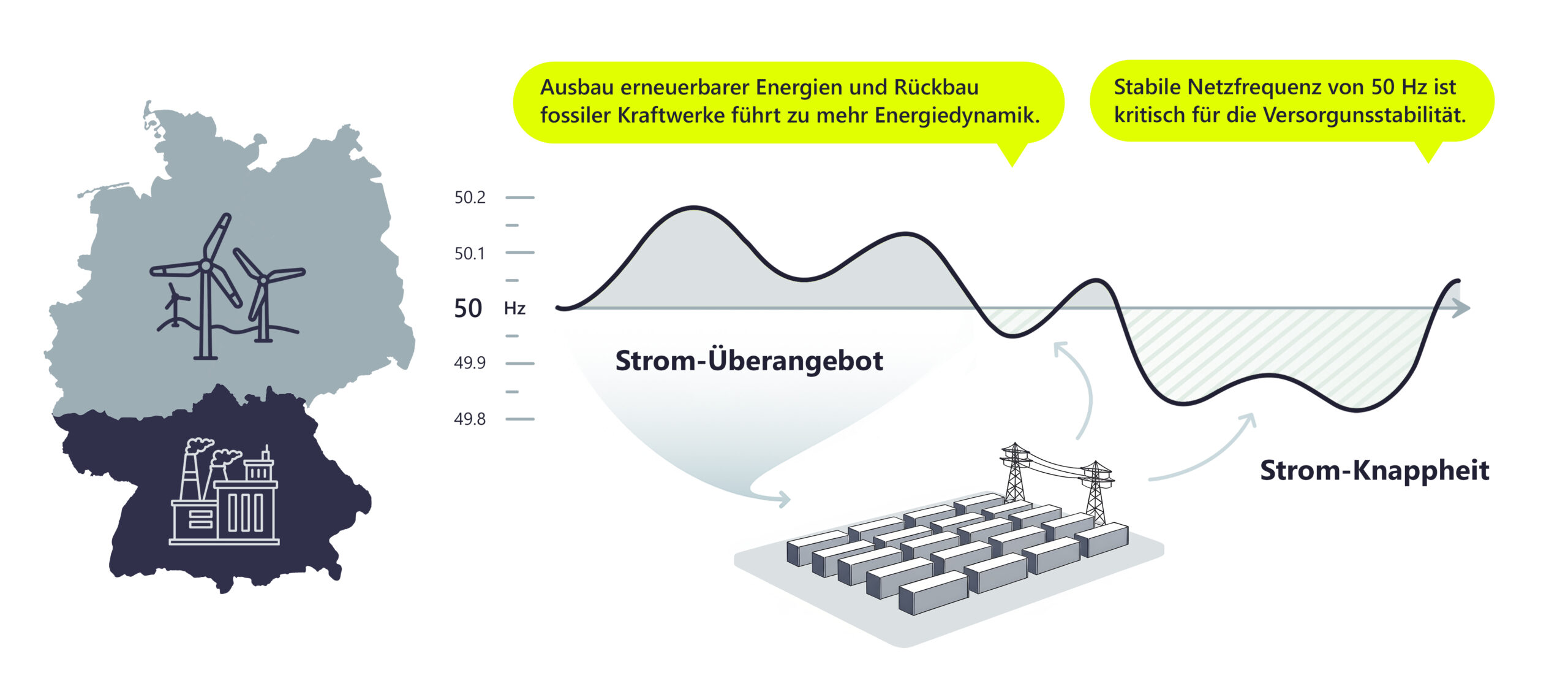 Die Speicher reagieren innerhalb von Millisekunden auf Schwankungen im Stromnetz. Sie gleichen Frequenzabweichungen aus, stabilisieren die Netzspannung und sorgen dafür, dass Energie jederzeit zuverlässig verfügbar bleibt, auch wenn Sonne und Wind gerade keine Energie liefern.